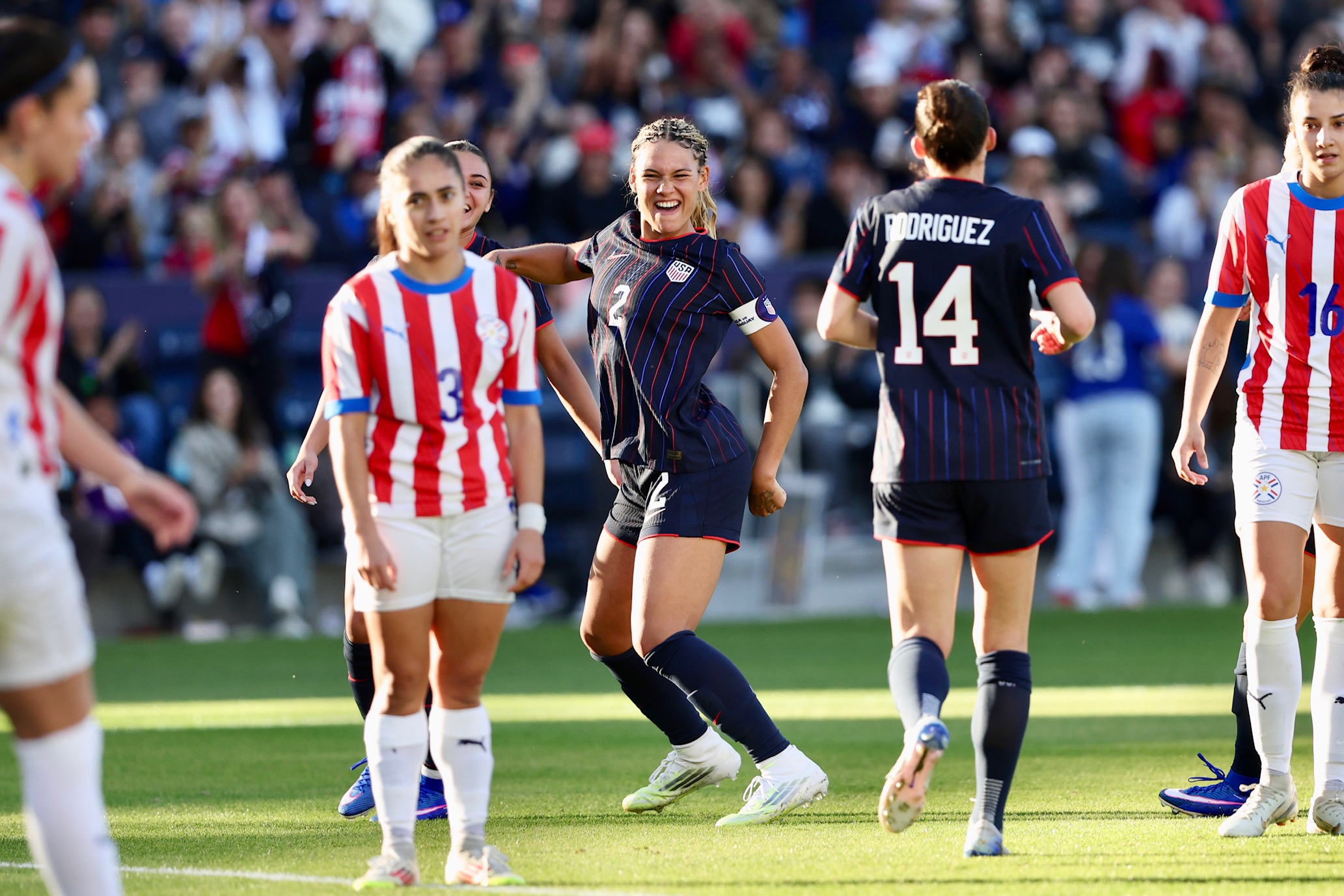 Once halftime arrived, the goals flowed in quick succession. Ally Sentnor logged a brace by scoring twice, including an early second-half strike that set the tone before an own goal from Paraguay’s defense further tilted the scoreline. Trinity Rodman, wearing the captain’s armband, netted her own strike on the night, along with a dazzling signature celebration, followed by Emma Sears adding another to complete the dominant display.